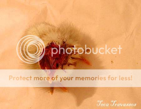 Hoje de manhã nasceu pintinho! Tão lindo! Um galo maldito (que a gente desconfia que é canibal) bicou ele todo! Ainda não sabemos os danos! Mas parece que furou um olho! (o vermelho da foto é sangue mesmo........) Vou passar a noite cuidando! DE NOVO!